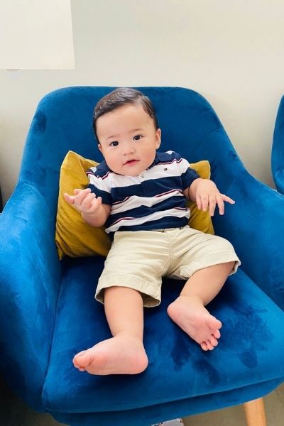 Casual formal en tonos azul cielo y blanco